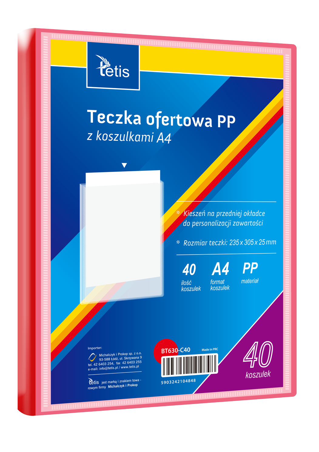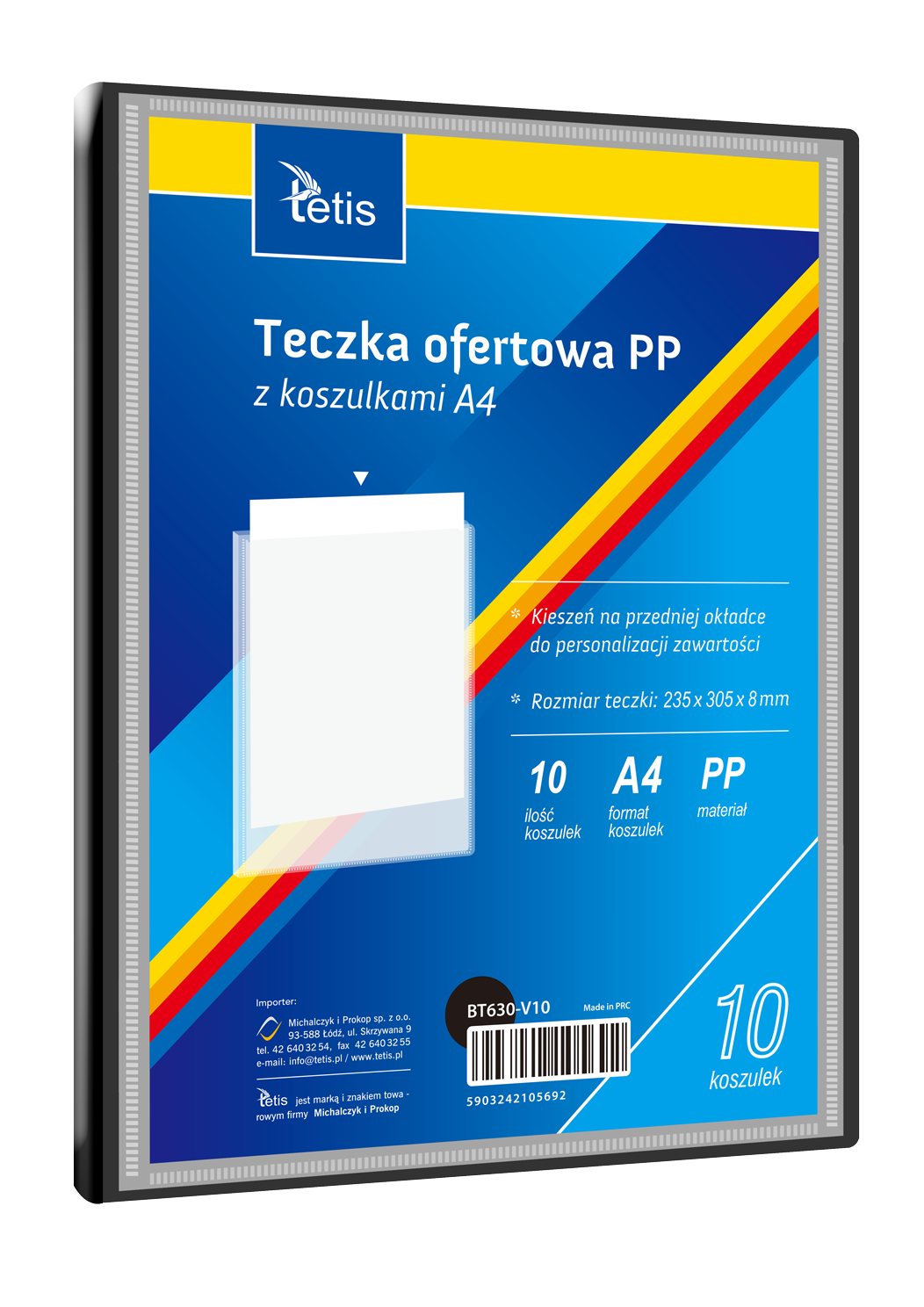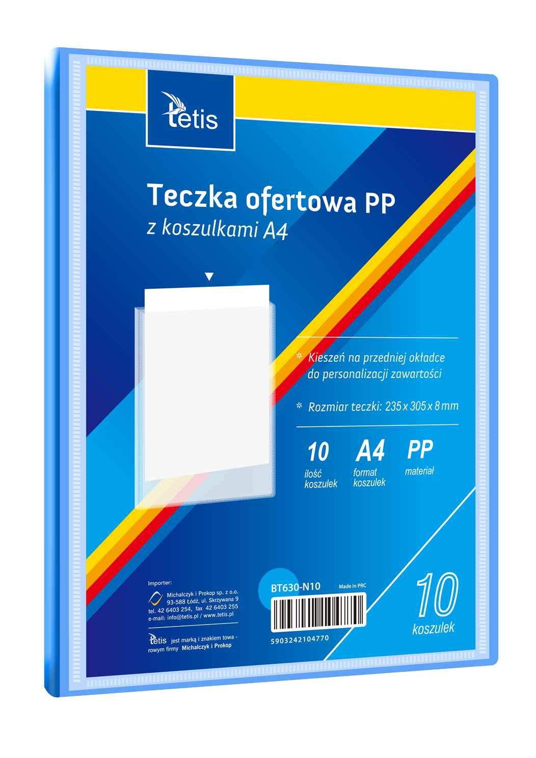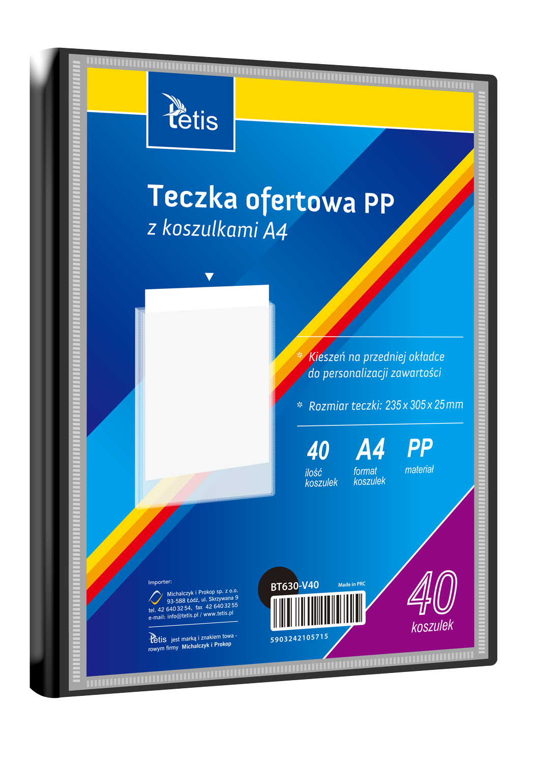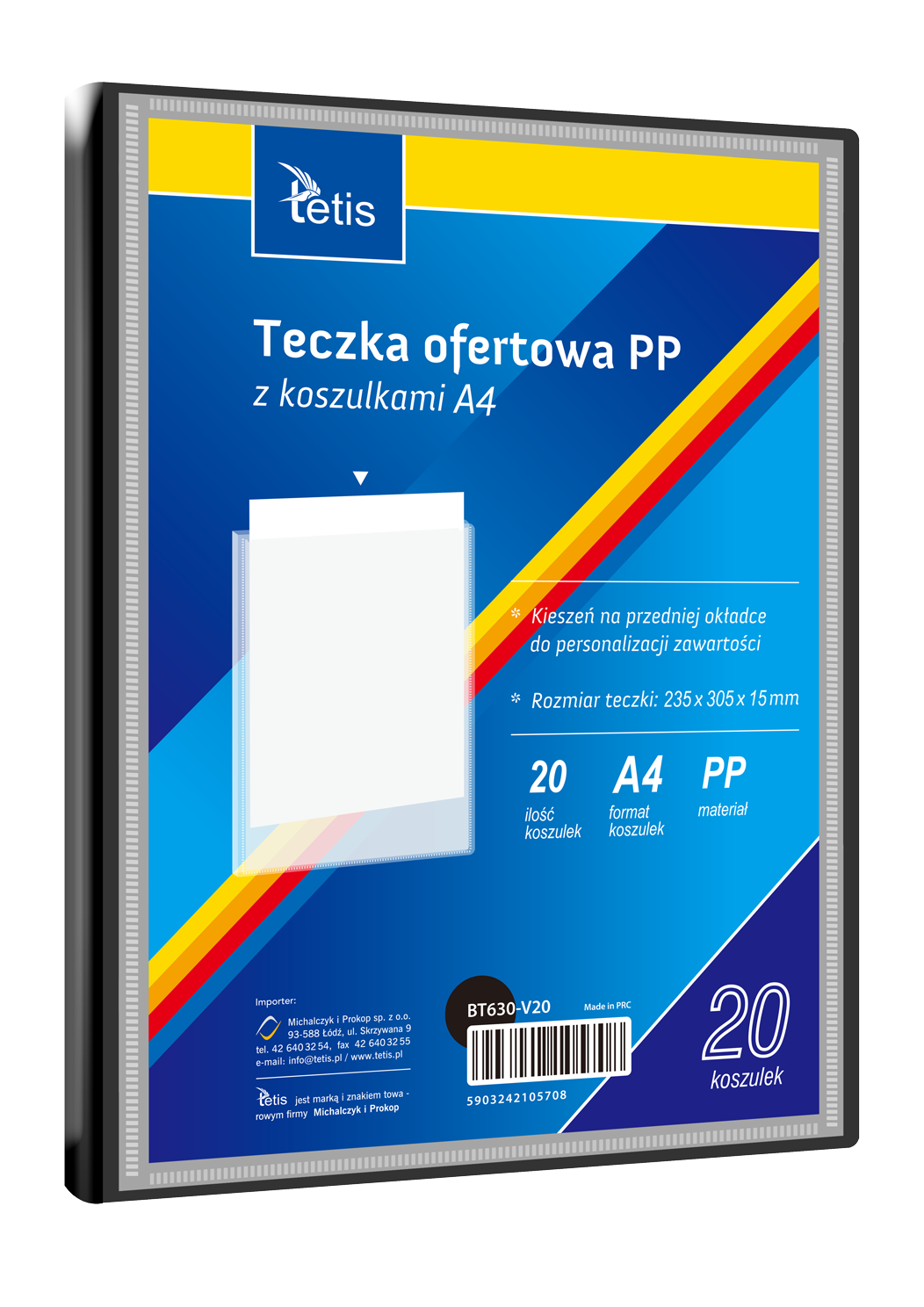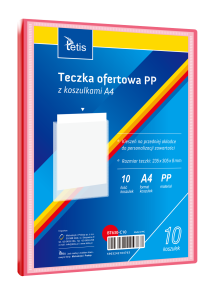 Teczka ofertowa PP z koszulkami. Posiada grzbiet i kieszeń opisową na przedniej okładce, format A4. Wymiary teczki: 305x235 mm, grubość tworzywa PP: 0,35 mm (dla grzbietu 8 mm i 15 mm) i 0,40 mm (dla grzbietu 25 mm i 30 mm). Opakowanie: folia 1 szt.