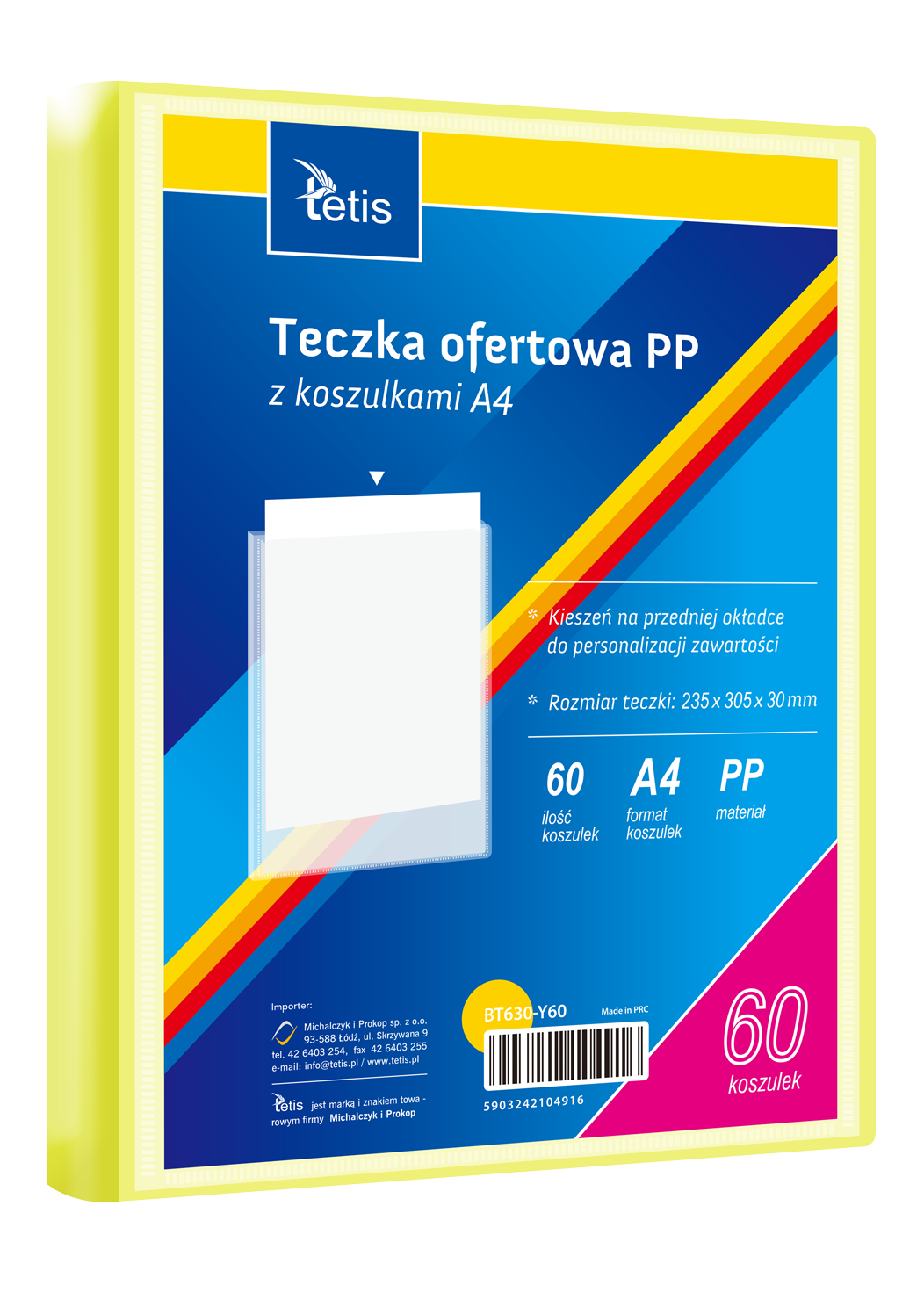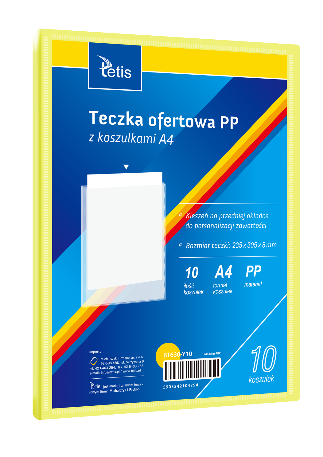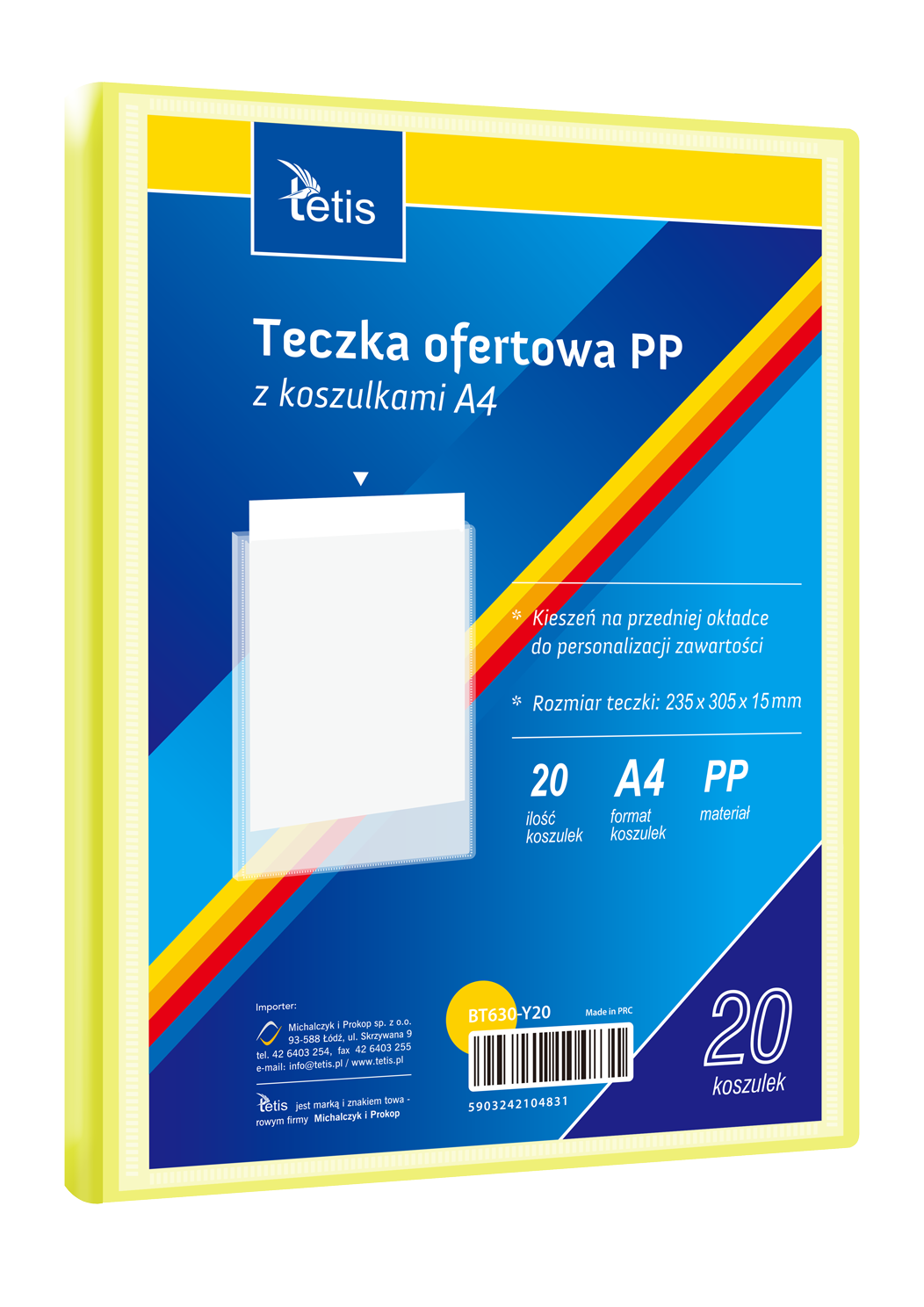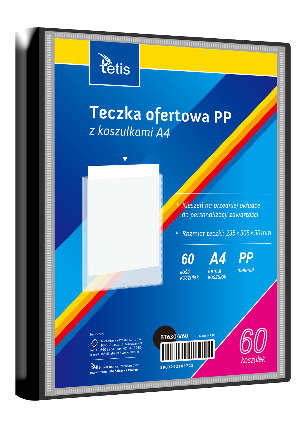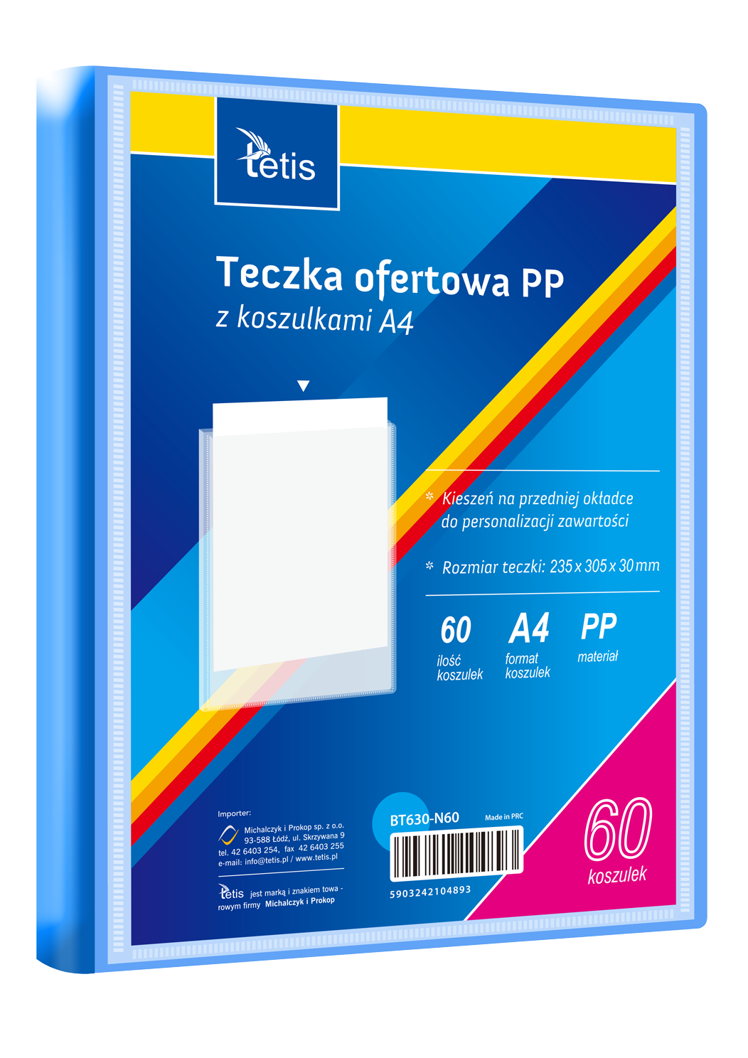 Teczka ofertowa PP z koszulkami. Posiada grzbiet i kieszeń opisową na przedniej okładce, format A4. Wymiary teczki: 305x235 mm, grubość tworzywa PP: 0,35 mm (dla grzbietu 8 mm i 15 mm) i 0,40 mm (dla grzbietu 25 mm i 30 mm). Opakowanie: folia 1 szt.